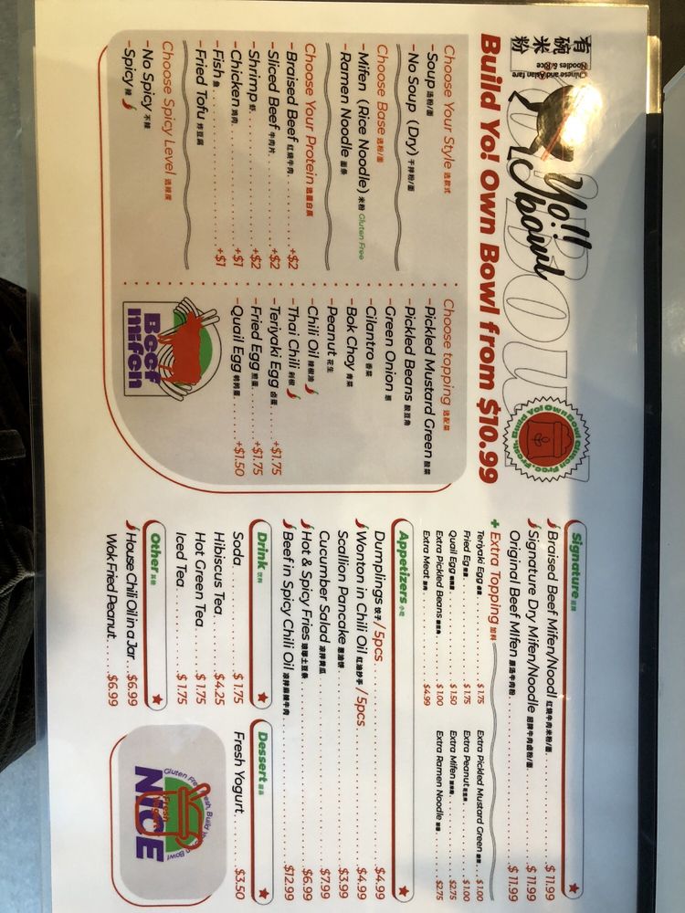 This is our signature Braised Beef Soup Noodle with choice of Mifen (rice noodle) or Ramen noodle. For the toppings it comes with green onion, cilantro and bok choy (Chinese cabbage) . By default the soup is mild spicy.